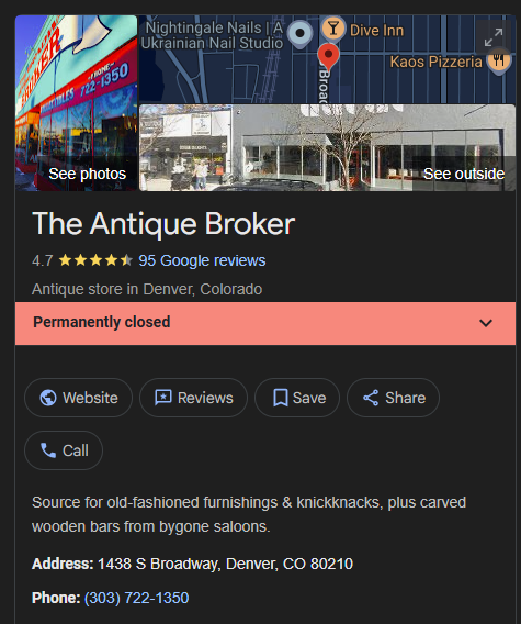 On February 27, 2021 I went to an antique store that I frequented with friends and family in Denver, CO. The store has since closed.
